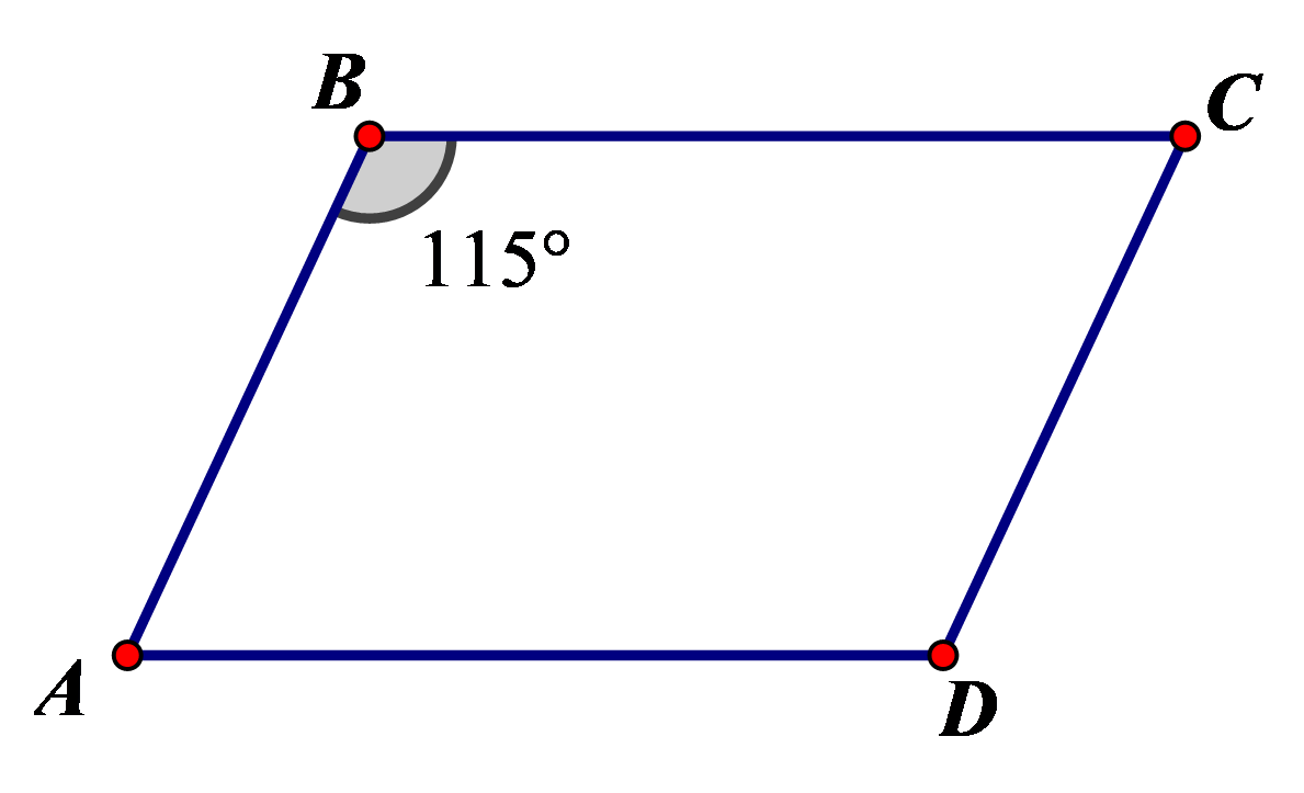 Cho hình bình hành `ABCD` có `\hat B = 115^\circ.` Các góc còn lại có giá trị bằng bao nhiêu?