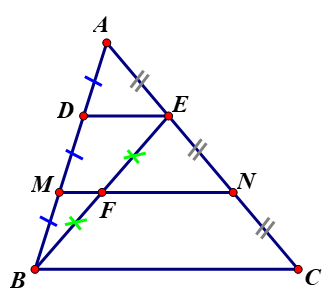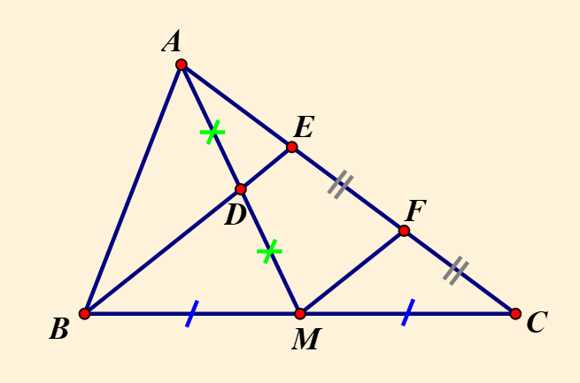 Cho tam giác `ABC`, đường trung tuyến `AM`. Gọi `D` là trung điểm của `AM`, `E` là giao điểm của `BD` và `AC`, `F` là trung điểm của `EC`.