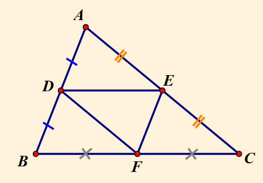 Xét `∆ABC: D, E, F` lần lượt là trung điểm của `AB; AC; BC` thì ta có `DE; EF; DF` là các đường trung bình của tam giác