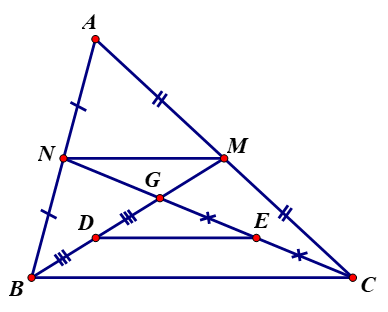 Dựa vào định lí về đường trung bình của tam giác để chỉ ra mối quan hệ độ dài giữa các cạnh `NM; DE; BC`
