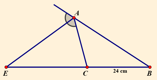Cho tam giác `ABC` có `BC = 24` `cm; AB = 2.AC`. Tia phân giác góc ngoài tại đỉnh `A` cắt đường thẳng `BC` ở `E`. Tính độ dài `EB`.