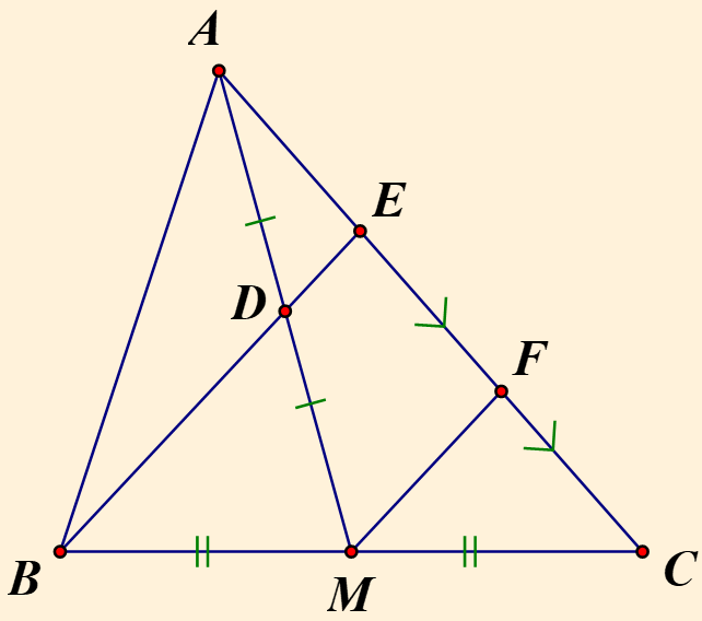 Cho tam giác `ABC`, đường trung tuyến `AM`. Gọi `D` là trung điểm của `AM`, `E` là giao điểm của `BD` và `AC`, `F` là trung điểm của `EC`. Chọn câu đúng trong các câu sau: