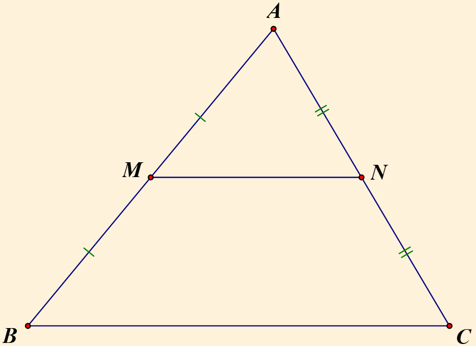 Vì `M, N` là trung điểm của `AB` và `AC` nên `MN` là đường trung bình của tam giác `ABC`