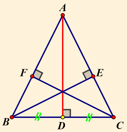 Chẳng hạn với `∆ABC` cân tại `A`, nếu `AD` là đường cao thì `AD` cũng đồng thời là đường trung trực của `BC`