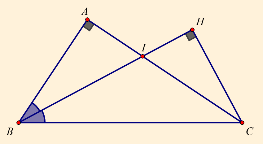 Cho tam giác `ABC` vuông tại `A,BI` là đường phân giác `(``I` thuộc `AC``)`. Kẻ `CH` vuông góc với đường thẳng `BI` `(``H` thuộc `BI``)`. Tam giác `ABI` đồng dạng với .....