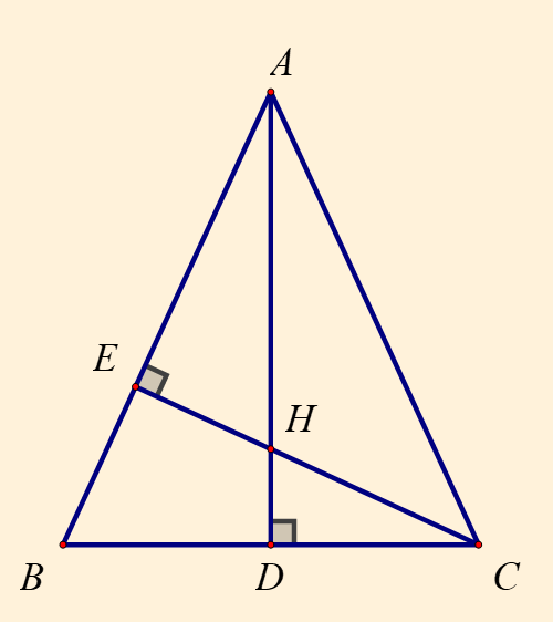 Cho tam giác `ABC` cân tại `A`, đường cao `AD`. Đường thẳng qua `C` và vuông góc `AB` tại `E`. Tính `AB`, biết `BC=18` `cm` và `BE=6`,`75` `cm`.