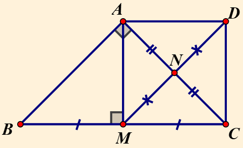 `=> AM ⊥ BC` và `AM =1/2 BC` (tính chất đường trung tuyến ứng với cạnh huyền của tam giác vuông)