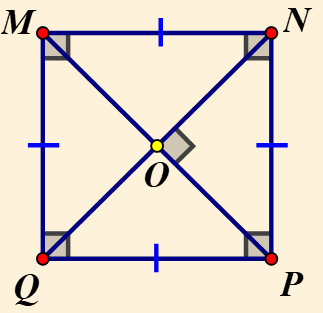 Xét hình vuông `MNPQ` có `O` là giao điểm của các đường chéo `MP; NQ`