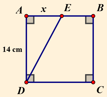 Cho `ABCD` là hình vuông có cạnh bằng `14 (cm);` điểm E thuộc cạnh `AB;` `AE = x (cm)`