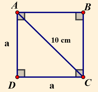 Giả sử hình vuông `ABCD` có độ dài các cạnh là `a (cm)` và độ dài đường chéo là `10 (cm)`