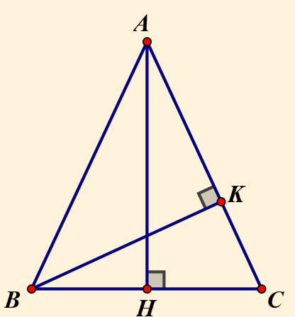 Mặt khác `BK` là đường cao ứng với cạnh bên `AC` nên ta cũng có: