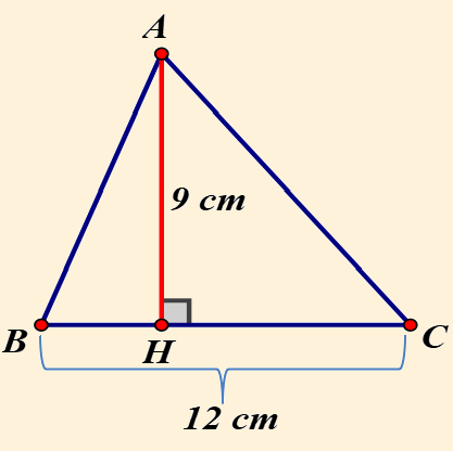 Cho tam giác `ABC`, đường cao `AH = 9 (cm)`, cạnh `BC = 12 (cm)`.