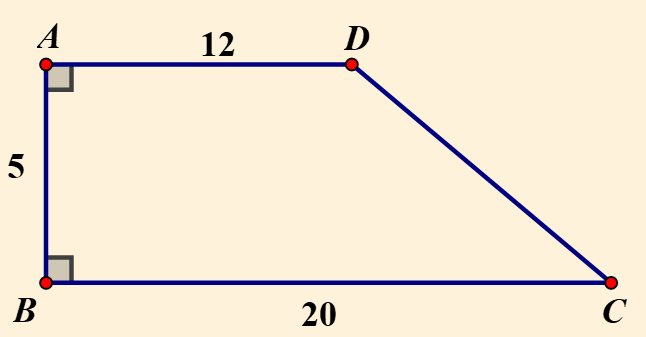 Biết `AB = 5 cm;  AD = 12 cm;  BC = 20 cm.`