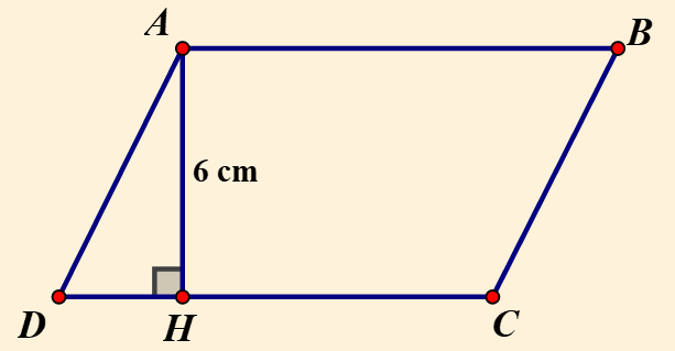 Diện tích hình bình hành `ABCD` là: `S_(ABCD)=AH.CD=6.12=``72(cm^2)`