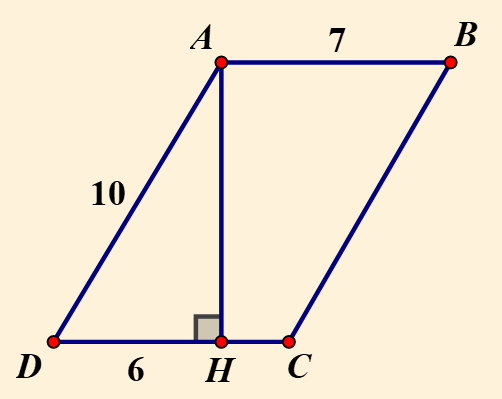 Cho hình bình hành `ABCD`, đường cao `AH` ứng với cạnh `DC`Biết `AB = 7 cm; AD = 10 cm;  HD = 6 cm`Tính diện tích hình bình hành `ABCD`?