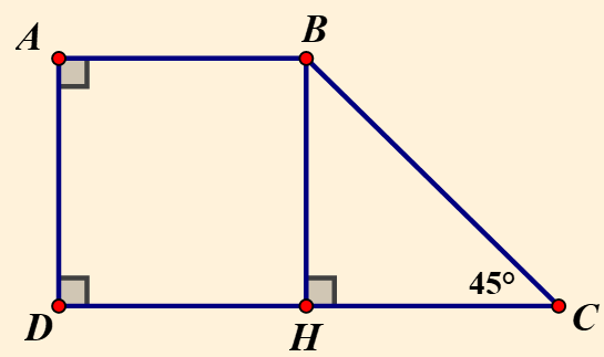 Tính diện tích hình thang `ABCD` biết `hat A=hat D=90^o;hat C=45^o;AB=2(cm);CD=4(cm)`.