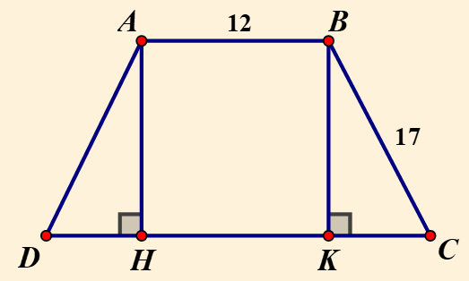 Hình thang cân `ABCD (AB //// CD)``AB = 12 (cm); CD = 28 (cm); AD = BC = 17 (cm)`.