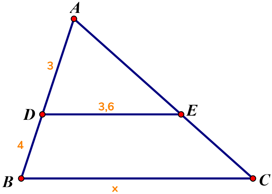 Cho hình vẽ. Biết `DE //// BC`; `AD = 3` `cm`; `DB = 4` `cm`; `DE = 3`,`6` `cm`.