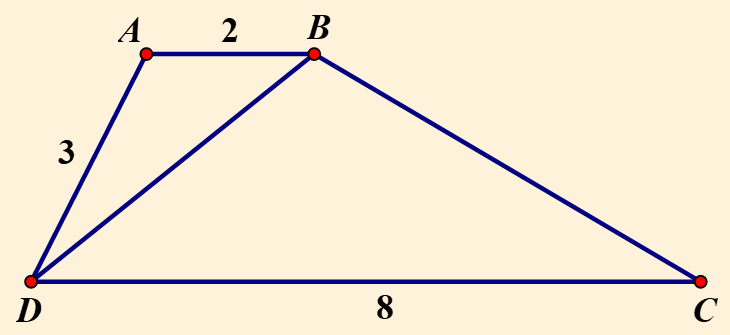 Cho tứ giác `ABCD` có đường chéo `BD` chia tứ giác đó thành hai tam giác `ABD;BDC`. Biết `△ABD ᔕ △BDC`; `AB=2` `cm;AD=3` `cm;CD=8` `cm`. Tính độ dài `BD;BC`?