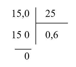 `150` chia `25` được `6`, viết `6`, `6` nhân `25` bằng `150`, `150` trừ `150` bằng `0`, viết `0`.