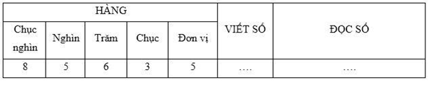 - Cho các chữ số trong mỗi hàng: Hàng chục nghìn, hàng nghìn, hàng trăm, hàng chục, hàng đơn vị; yêu cầu viết thành số.