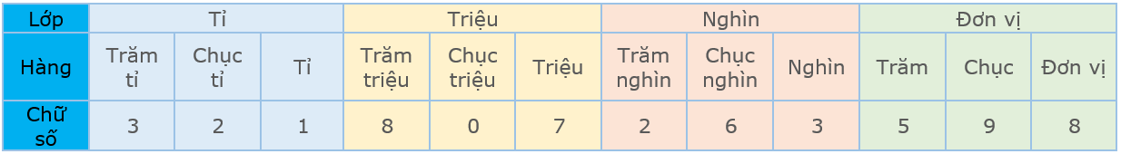 * Chẳng hạn số `321` `807` `263` `598` đọc là ba trăm hai mươi mốt tỉ, tám trăm linh bảy triệu, hai trăm sáu mươi ba nghìn, năm trăm chín mươi tám. Lớp, hàng của số `321` `807` `263` `598` được phân tích trong bảng sau: