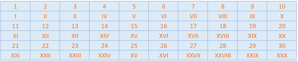 + Sử dụng các chữ số `I;V;X` (có giá trị lần lượt là `1;5;10`)