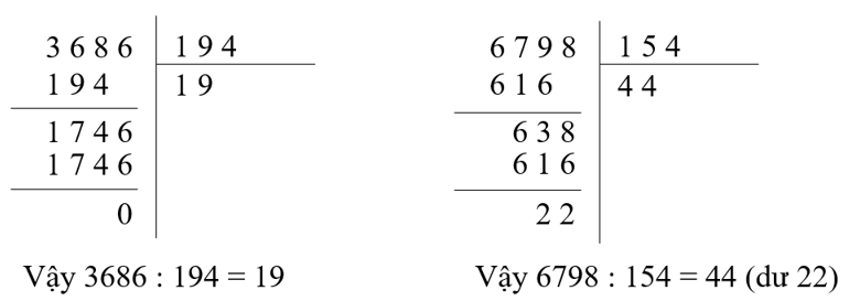 Ví dụ: thực hiện các phép chia sau: `3686:194` và `6798:154`