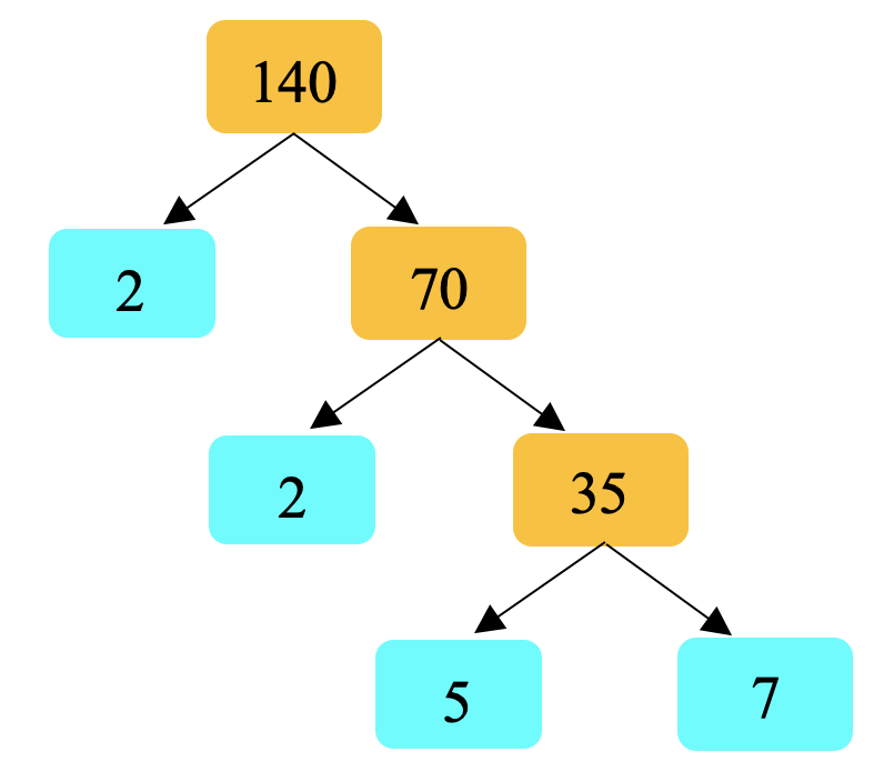 Ví dụ: Để phân tích số `140` ra thừa số nguyên tố theo cột dọc, ta lần lượt chia `140` cho các ước là số nguyên tố của nó (nên theo thứ tự từ ước nhỏ nhất đến ước lớn nhất).