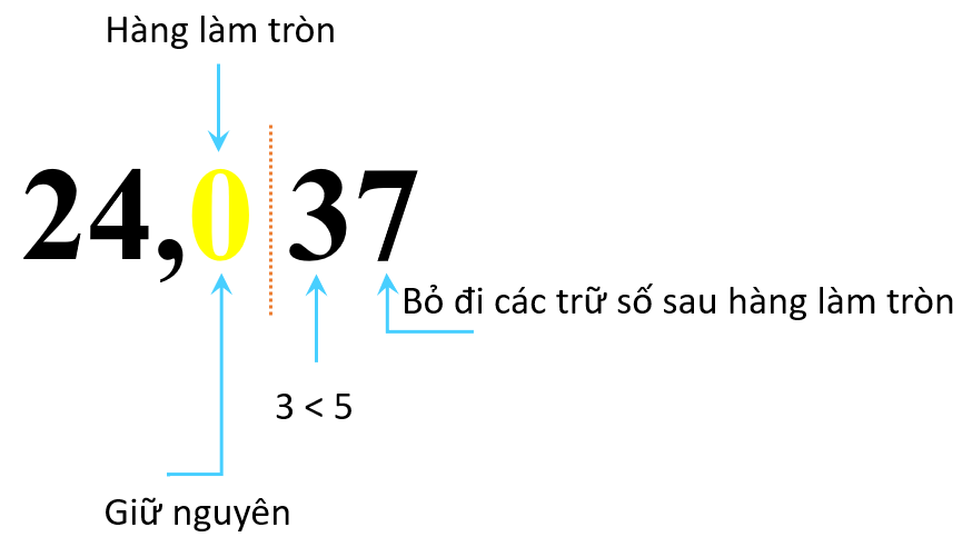 - Nếu chữ số đứng ngay bên phải hàng làm tròn nhỏ hơn `5` thì ta thay lần lượt các chữ số đứng bên phải hàng làm tròn bởi chữ số `0`.