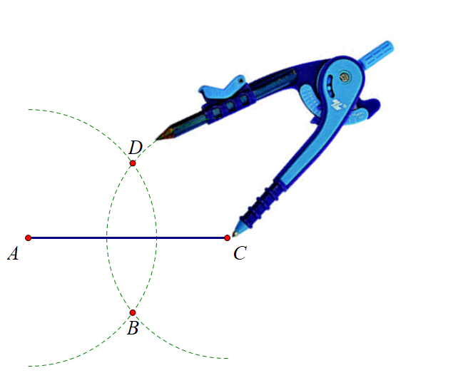 Bước 3: Dùng compa vẽ một phần đường tròn tâm C bán kính `5` `cm`; phần đường tròn này cắt phần đường tròn tấm A vẽ ở Bước 2 tại các điểm B và D.