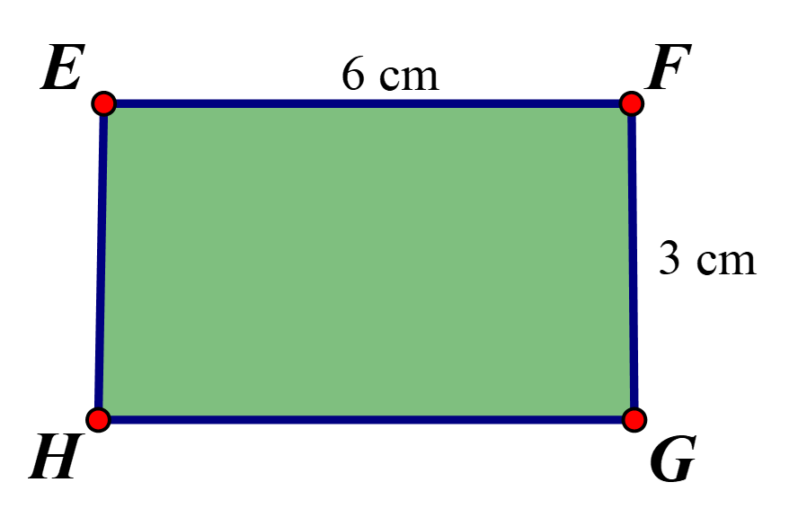 Ví dụ: Cho hình chữ nhật `EFGH` có `EF = GH = 6 cm`; `EH = FG = 3 cm`. Tính chu vi và diện tích hình chữ nhật `EFGH`.