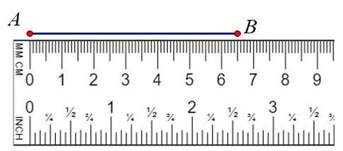 Cho đoạn thẳng AB. Đặt cạnh của thước đi qua hai điểm A và B sao cho điểm A trùng với vạch số `0` của thước và nhìn xem điểm B trùng với vạch chỉ số bao nhiêu.