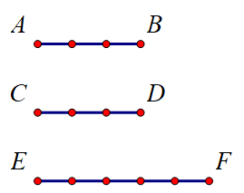 Ví dụ: Độ dài các đoạn thẳng: AB = `3` `cm`, CD = `3` `cm`, EF = `5` `cm` (như hình vẽ).