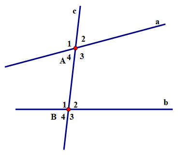 Cho đường thẳng `c` cắt hai đường thẳng `a` và `b` lần lượt tại `A` và `B` tạo thành bốn góc đỉnh `A`, bốn góc đỉnh `B` được đánh số như hình vẽ. Như vậy, ta có: