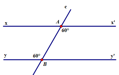 Nếu đường thẳng `c` cắt hai đường thẳng phân biệt `a,b` và trong các góc tạo thành có một cặp góc so le trong bằng nhau hoặc một cặp góc đồng vị bằng nhau thì a và b song song với nhau