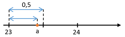 Trên trục số, ta thấy khoảng cách từ điểm `23` đến điểm `a=23,4122…` nhỏ hơn `0,5` (bằng một nửa khoảng cách từ điểm `23` đến điểm `24`).