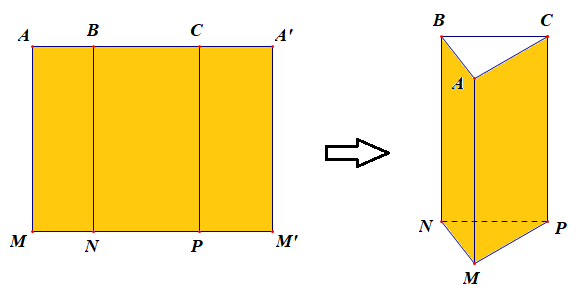 `+` Gấp các cạnh `BN` và `CP` sao cho cạnh `AM` trùng với `A'M'`, ta được hình lăng trụ đứng tam giác `ABC.MNP`.