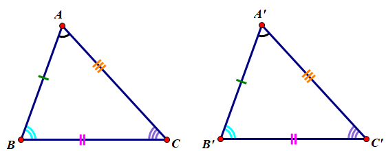 Hai tam giác `ABC` và `A’B’C’` bằng nhau nếu chúng có các cạnh tương ứng bằng nhau và các góc tương ứng bằng nhau.