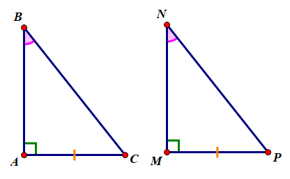 `-` Nếu một cạnh góc vuông và góc nhọn kề cạnh ấy của tam giác vuông này bằng một cạnh góc vuông và góc nhọn kề cạnh ấy của tam giác vuông kia thì hai tam giác vuông đó bằng nhau.