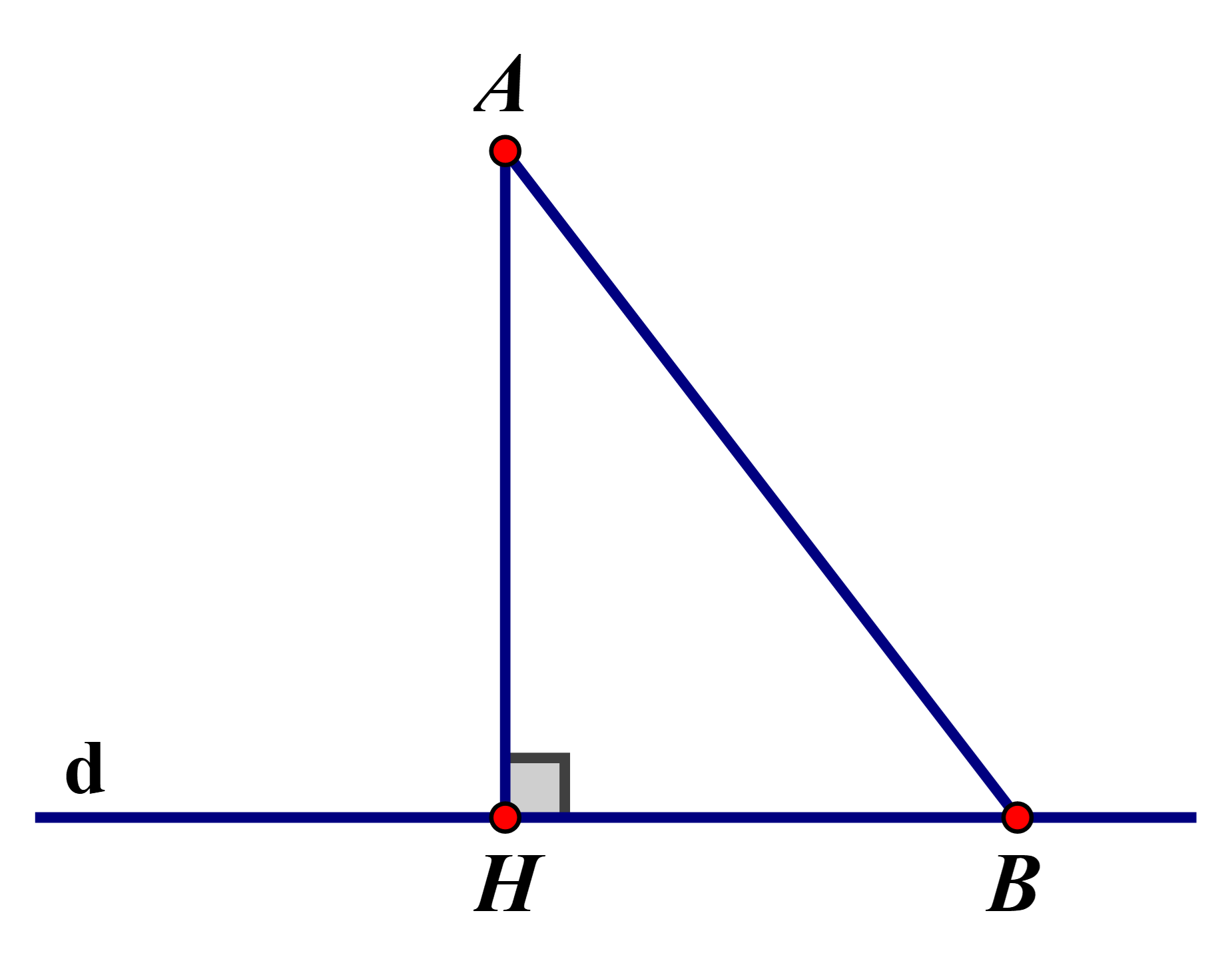 Từ một điểm `A` không nằm trên đường thẳng `d`, kẻ đường vuông góc `AH` và một đường xiên `AB` tùy ý đến đường thẳng `d` `(B ne H)` thì `AH<AB`