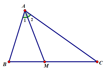 `-` Trong tam giác `ABC`, tia phân giác của góc `A` cắt cạnh `BC` tại điểm `M` thì đoạn thẳng `AM` gọi là đường phân giác (xuất phát từ đỉnh `A`) của tam giác `ABC`