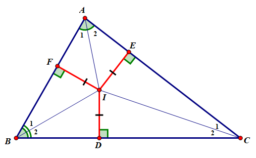Cụ thể: `triangleABC` có ba đường phân giác cùng đi qua điểm `I` và điểm `I` cách đều ba cạnh của tam giác hay `ID=IE=IF`