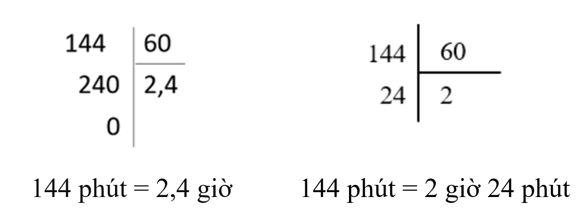 +) `144` phút `= 2` giờ `24` phút `= 2`,`4` giờ: