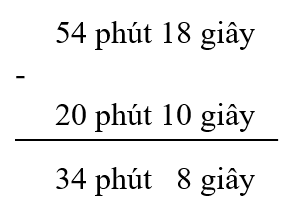 Ví dụ `1`: Tính: `54` phút `18` giây `- 20` phút `10` giây