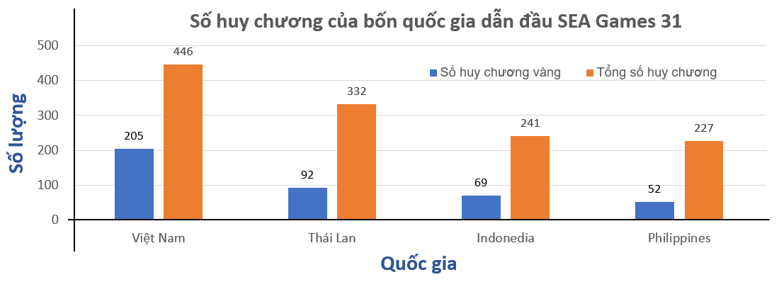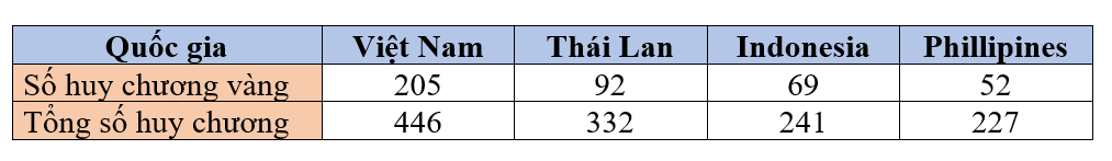 VD1: Thống kê số huy chương bốn quốc gia dẫn đầu SEA Games `31` được cho trong bảng số liệu sau:
