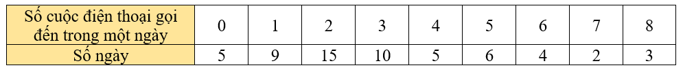 - Trong `59` ngày theo dõi có `5` ngày không có cuộc gọi, ` 9` ngày có `1` cuộc gọi, `15` ngày có `2` cuộc gọi và `10` ngày có `3` cuộc gọi.