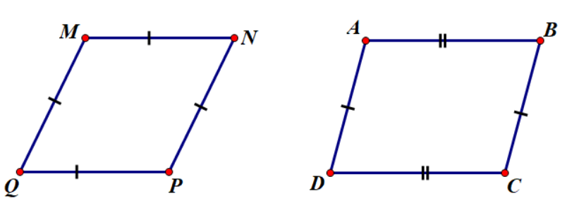 `-` Tứ giác `MNPQ` có bốn cạnh bằng nhau nên là hình thoi.