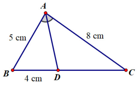 VD`2`: Cho tam giác `ABC` có `AB = 5` cm, `AC = 8` cm. Đường phân giác của góc `A` cắt `BC` tại `D`. Biết `DB = 4` cm, tính `DC`.