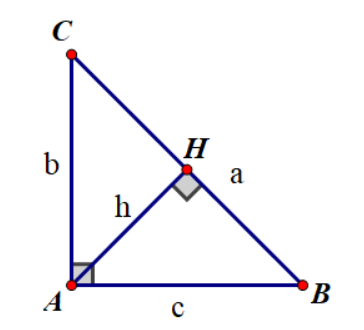 `-` Nếu tam giác vuông `ABC` tại `A` có đường cao `AH = h`, các cạnh `BC = a, AC = b, AB = c` thì `h.a = b.c`